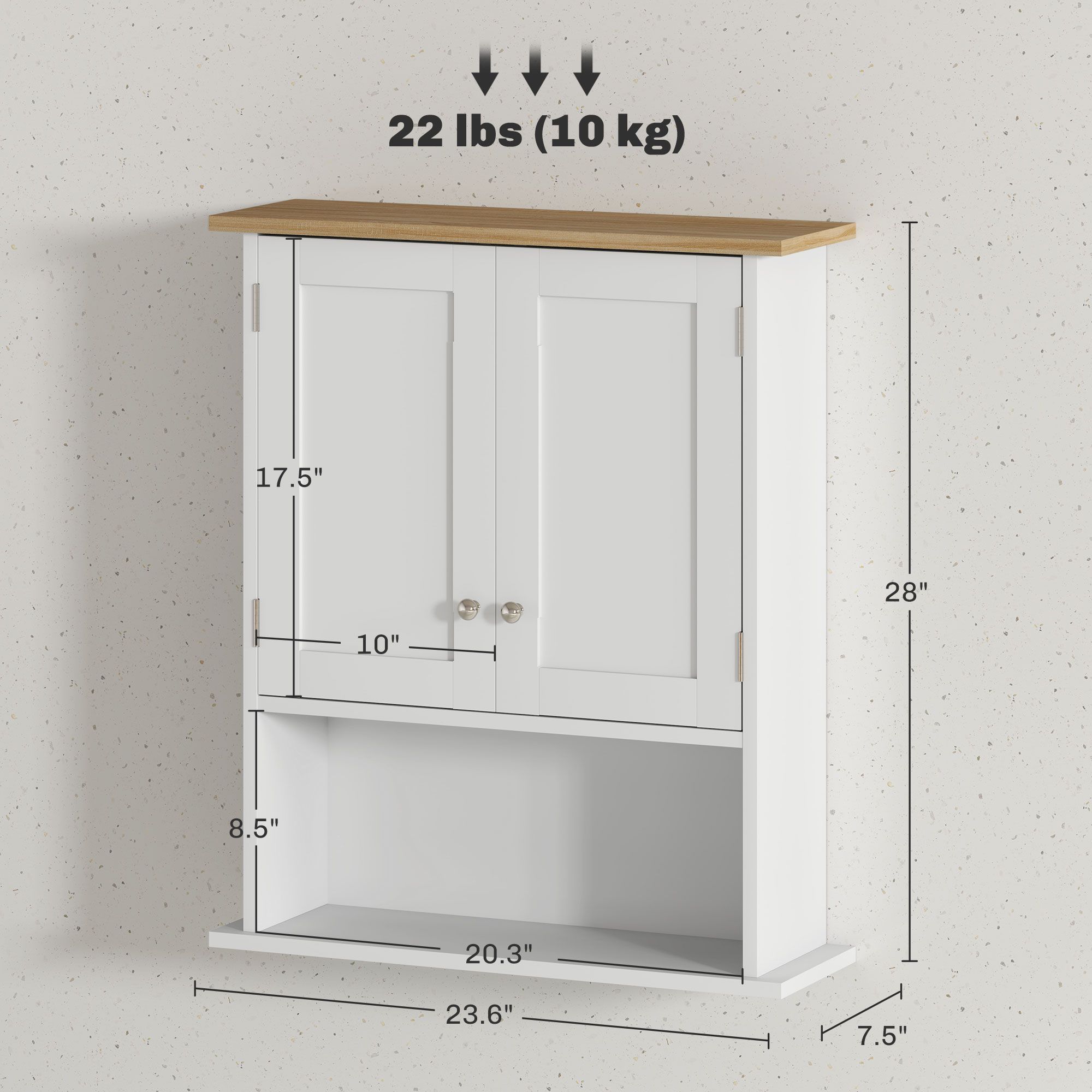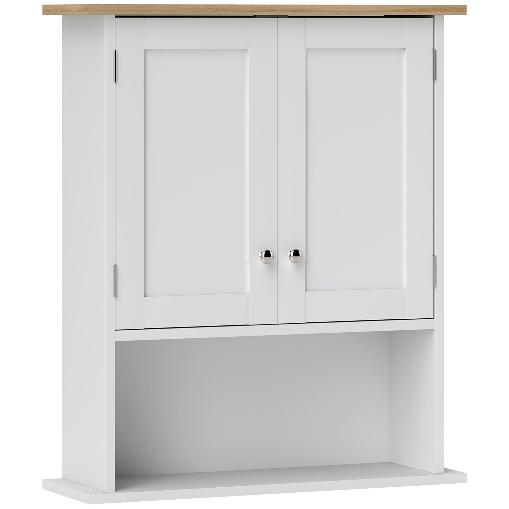Maximize your bathroom's style and storage with a bathroom wall cabinet from HOMCOM. This chic, space-saving solution features a 2-tier cabinet with adjustable shelving and an open shelf to help stow essentials. Its modern white finish, recessed panels, and oak-toned top blend functionality with elegance, making it a great wall mount cabinet for any contemporary space.